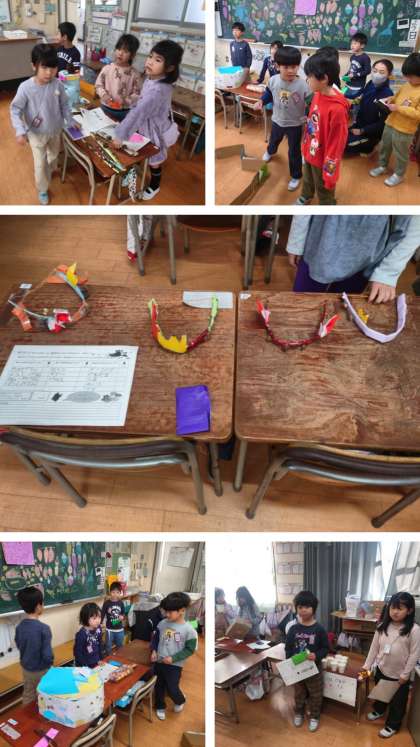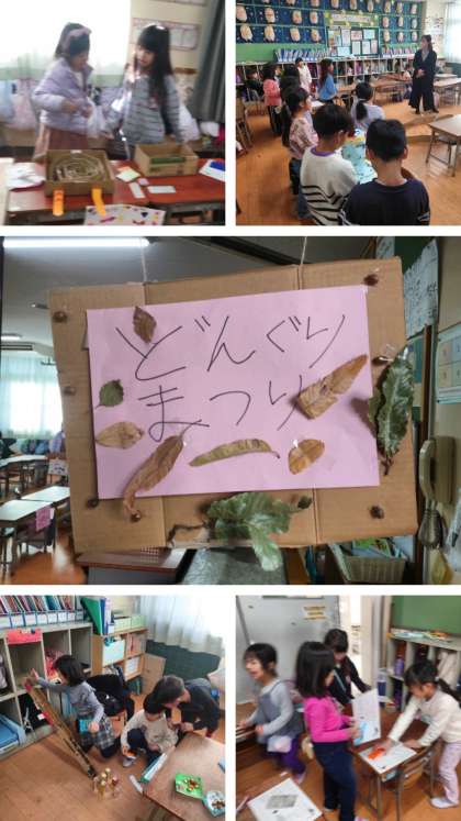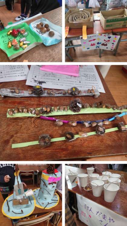 鶴見緑地で見つけたどんぐりやまつぼっくり、落ち葉などを使って遊ぶ、楽しいお店をみんなで開きます。