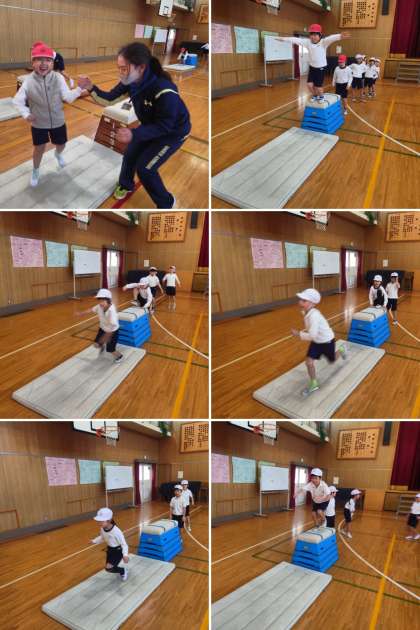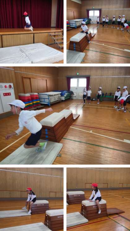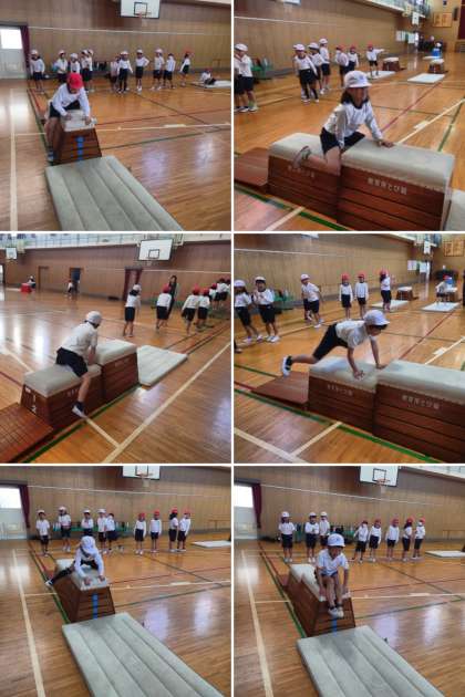 とび箱を跳んだり、上を歩いたり、またいで進んだり、マットにとび降りたり、平均台の上を歩いたり、次々といろいろな運動をしながら楽しく基礎体力を養っていきます。