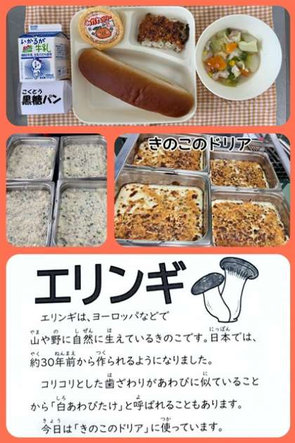 今日の献立は、きのこのドリア・鶏肉と野菜のスープ煮・みかんゼリー・黒糖パン・牛乳でした。