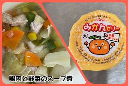 「鶏肉と野菜のスープ煮」は、鶏肉、じゃがいも、キャベツ、にんじん、さんどまめ、コーンを使用しています。