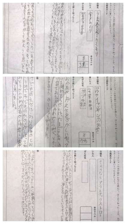 国語科の時間は、ノンフィクションの本や図鑑などを読んで、初めて知ったことや驚いたことをカードにまとめました。