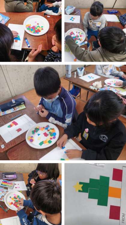 英語活動の時間は、お店屋さんとお客さんに分かれて、"What do you want?""How many?"などの表現を使って、いろいろな色や形のパーツを集めました。