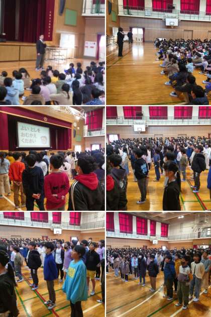 続いて、生活指導担当より冬休みのくらしについて、子どもたちに「新年の目標を立てる」「断る勇気をもつ」についての話をしました。