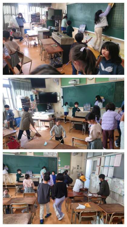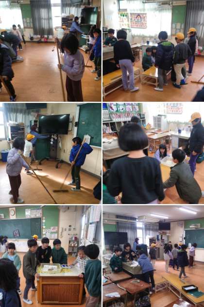午前中、各学級で学習をしたり、お楽しみ会をしたり、通知表を渡したり、冬休みの生活について話をしたり、大そうじをしたりしてすごしました。