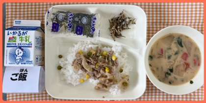 明日の献立は、鶏肉とじゃがいものガーリック焼き・スープ煮・ブロッコリーのサラダ・レーズンパン・牛乳です。