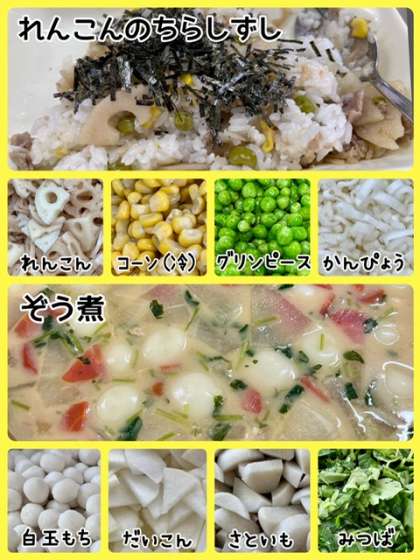 献立は、れんこんのちらしずし(きざみのり)・ぞう煮・ごまめ・牛乳でした。