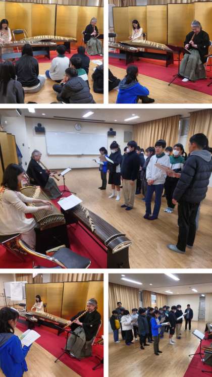 それぞれの楽器の仕組み、演奏の仕方などのお話を聞いたり、「六段の調(しらべ)」「春の海」など有名な曲の演奏を聴いたりしました。