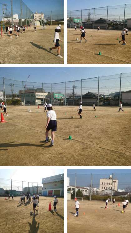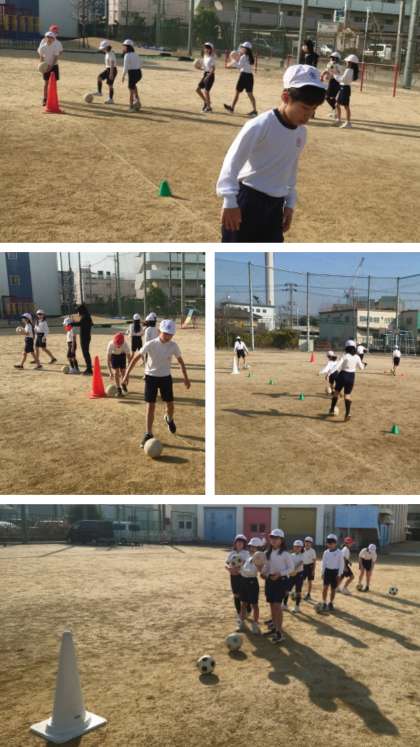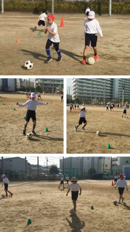 今日は、コーンの間をボールをけりながら運ぶ練習をしました。