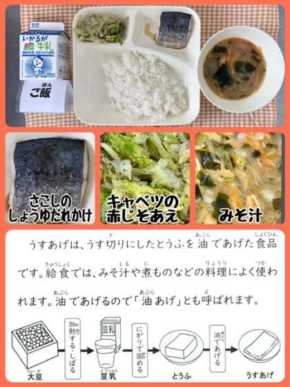 今日の献立は、さごしのしょうゆだれかけ・みそ汁・キャベツの赤じそあえ・ごはん・牛乳でした。