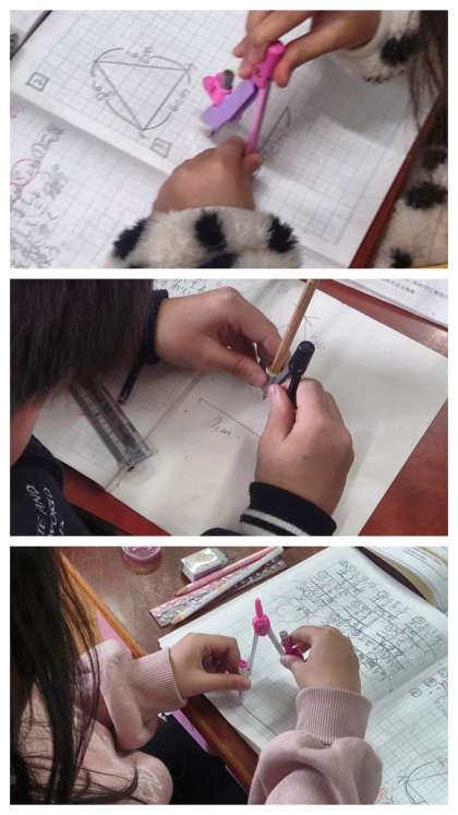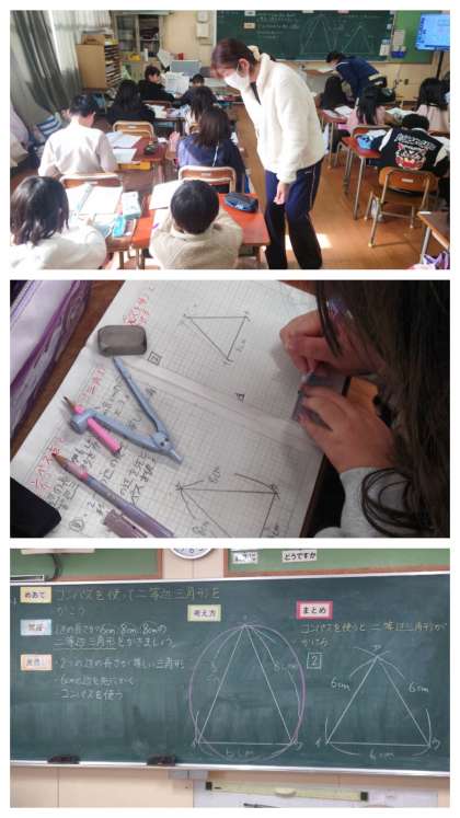 算数科の時間は、コンパスを使って二等辺三角形を描く方法を学習しました。