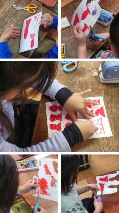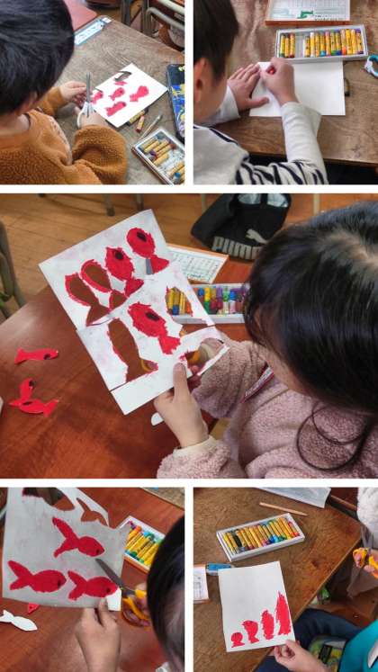 画用紙にパスで色を塗って切り抜き、「スイミー」をたくさん作っています。