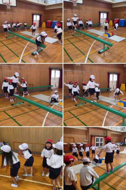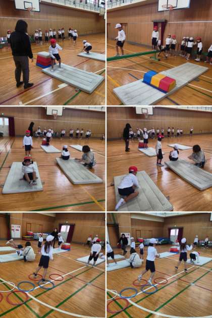 とび箱、マット、平均台、フープなどを使って、一人一人が楽しく体を動かしました。