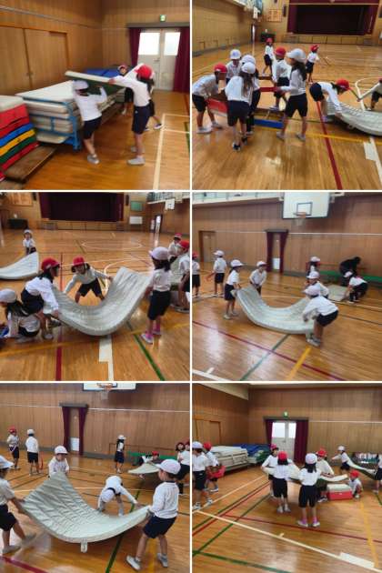 体育科の時間は、とぶ、まわる、のる、おりる、バランスをとるなど、いろいろな運動の基本の力を身につけるようサーキットトレーニングをしました。