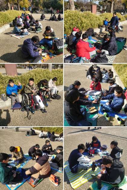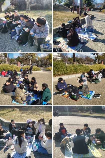 大阪城天守閣が正面に見えるところで、子どもたちが楽しみにしているお弁当タイムです。