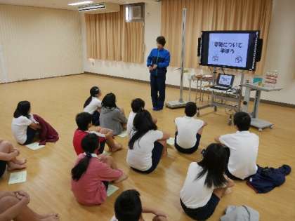 6年生が発育測定をしています。保健室の先生が発育測定の前に、健康にかかわるお話をいつもしてくれます。今回は「姿勢について学ぼう」がテーマです。