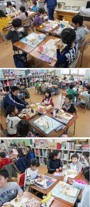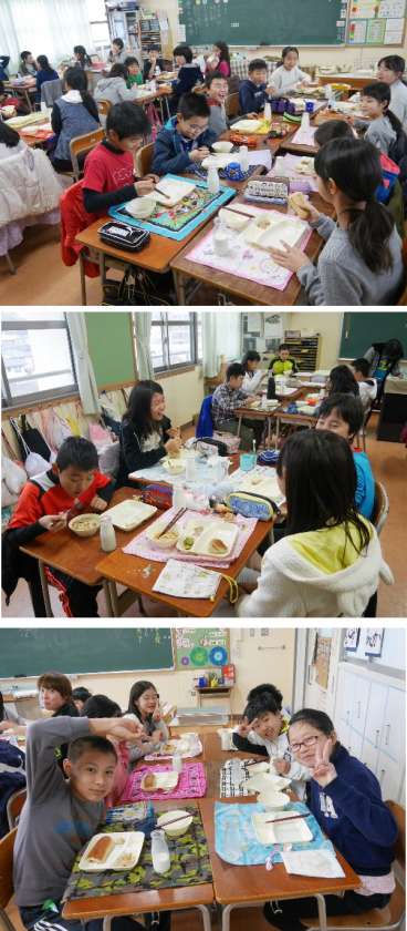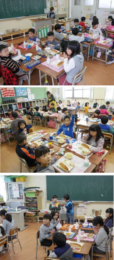今日から3学期の給食が始まりました。今日のメニューは、鶏肉のオイスターソース焼き、ラーメン、ピリ辛あえ、パン、牛乳です。おいしい笑顔で、友だちとの給食は楽しいね。