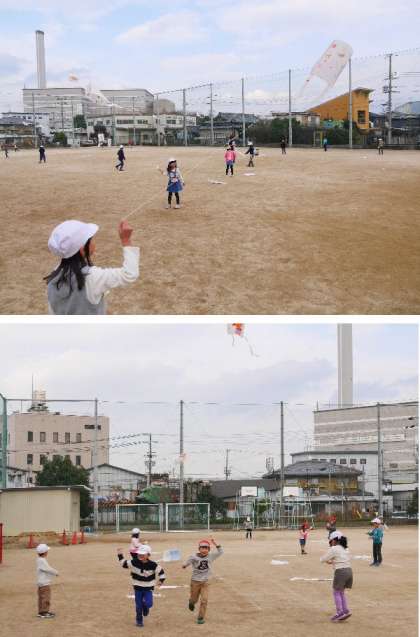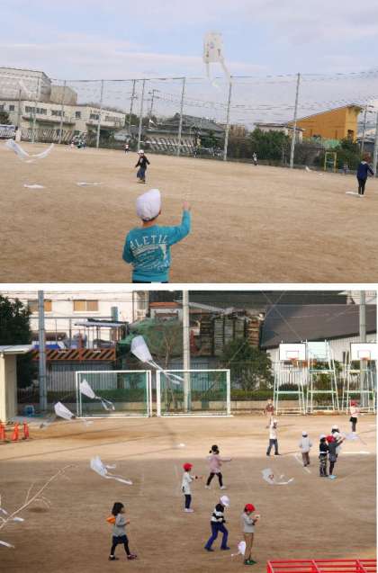冬は凧あげ!1年生が運動場で上手にあげて