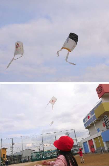 1年生では、ビニールで凧をつくりました。みんなで運動場であげています。そんなに走り回らなくても風をうけるようにすると高くあがるんだよ。少し風があったので、何をしなくても自然にあがります。元気よく走りまわって糸がからまって大変です。とても楽しそうです。