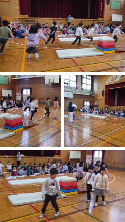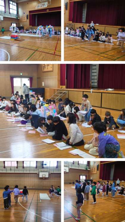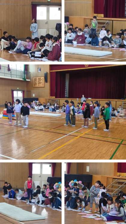 講堂で、2クラス合同で2月20日の学習発表会の練習をしました。