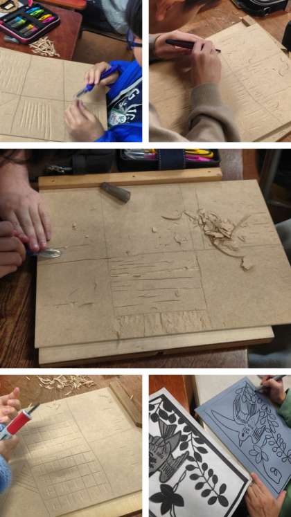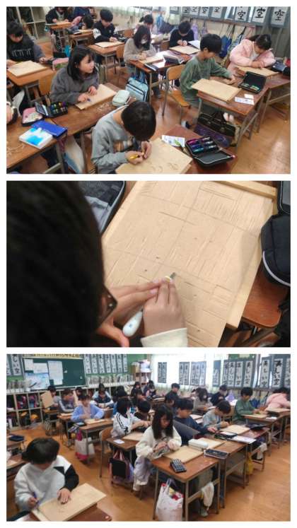図工科の時間は、彫刻刀を使って版画の作品を制作します。