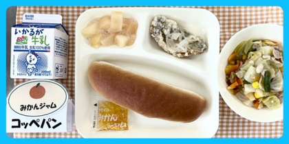 今日の献立は、あじのレモンマリネ・てぼ豆のスープ煮・白桃(カット缶)・コッペパン・みかんジャム・牛乳でした。