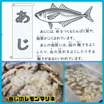 「あじのレモンマリネ」は、1人1枚のあじを油であげ、たまねぎ、砂糖、塩、米酢、ワイン、レモン汁で作った調味液を配缶時にからませています。生のレモンをしぼったレモン汁は、最後に加えることで風味を残すようにしています。