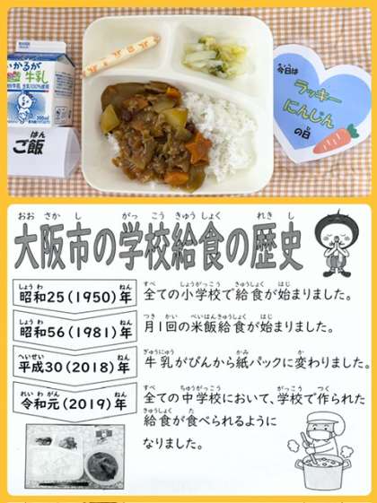 「豚肉と金時豆のカレーライス」は、豚肉を主材に、じゃがいも、ドライパックの金時豆、たまねぎ、にんじんを使用したカレーライスです。給食室で、いろんな形のラッキーにんじんをたくさん作っていただきました。