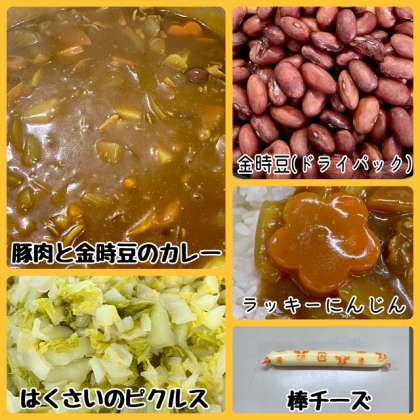 今日の献立は、豚肉と金時豆のカレーライス・はくさいのピクルス・棒チーズ・牛乳でした。