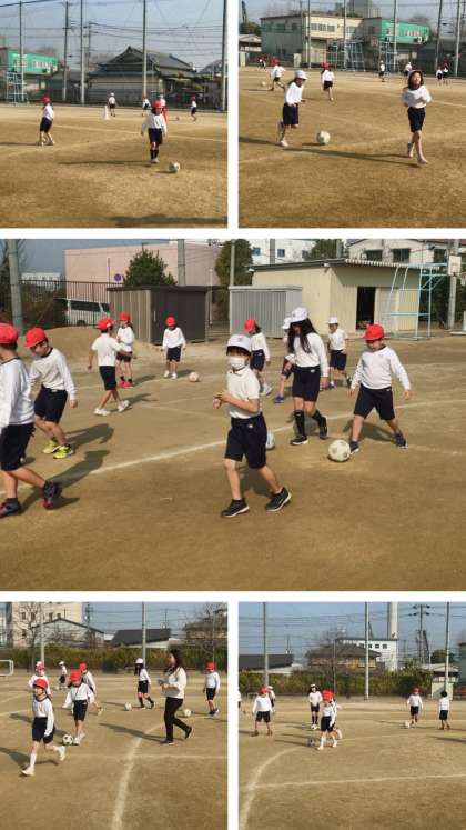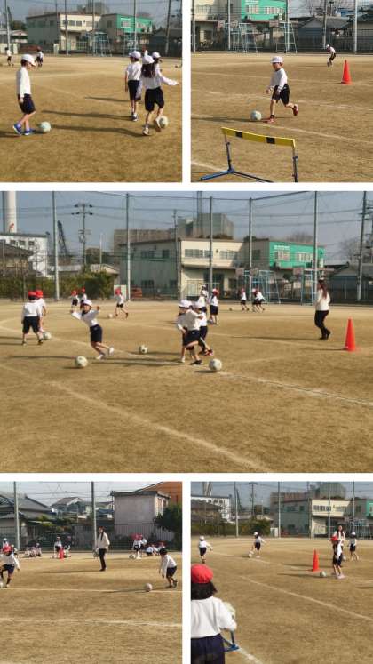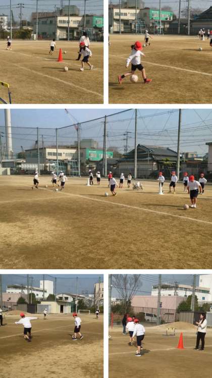 2人組でボールをけって運んだり、1人でボールをゴールの近くまで運んでシュートしたりして練習しました。