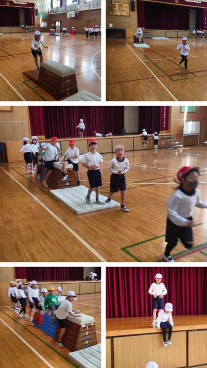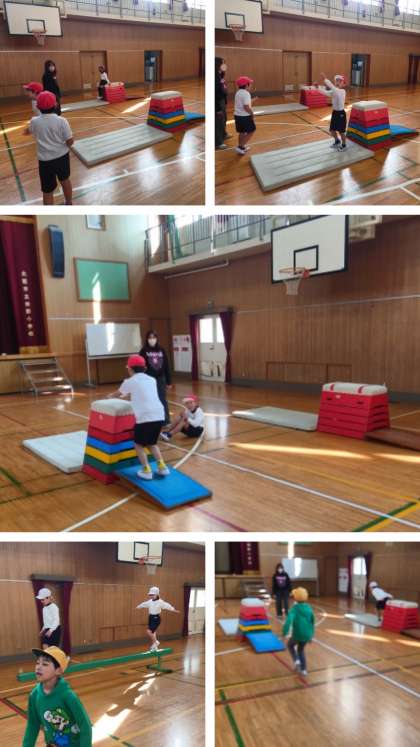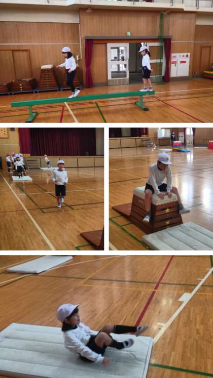 とび箱、マット、平均台などを使って、一人一人が楽しく体を動かしました。