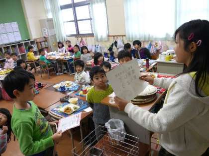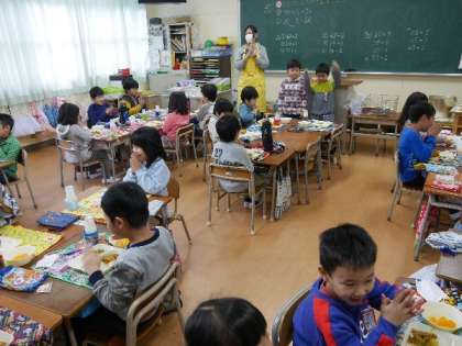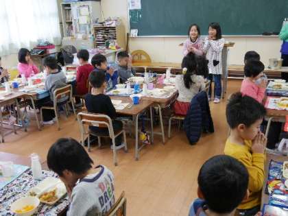 6年生の給食委員が1年生の教室で、今月の給食目標を説明しています。おいしい毎日の給食に感謝しながら、残さずに食べましょう。
