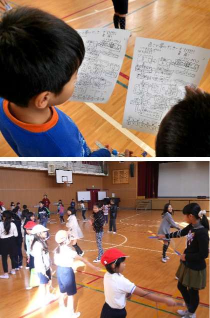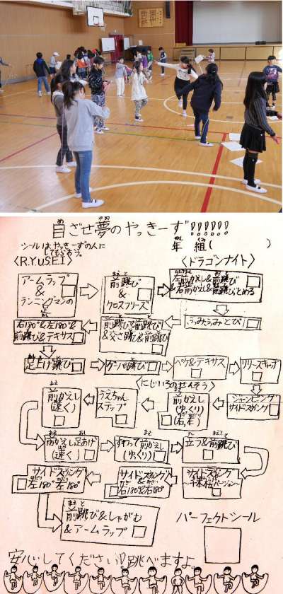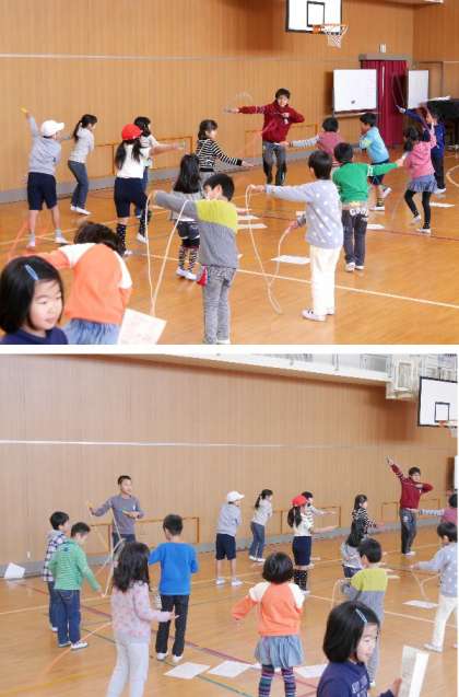 おおさかジャンプアップ大会自由演技部門で優勝した焼野やっきーずが、毎日20分休みに、体育館でなわとびを教えてくれます。かっこいいポーズでなわとびです。低学年も集まってきました。