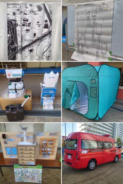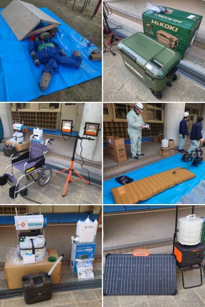 今日の防災訓練では、本校の備蓄倉庫の中にあるいろいろな災害用物資を実際に使ってみる体験をしました。