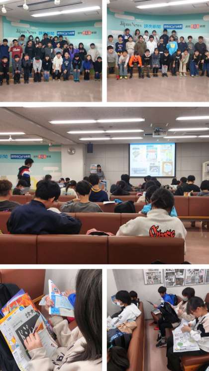 新聞社では、学級ごとに記念撮影をしたあと、新聞がどのようにして発行されるのかについてお話を聞きました。