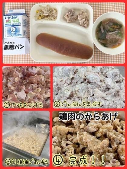 今日の献立は、鶏肉のからあげ・ハムと野菜の中華スープ・もやしとコーンの中華あえ・黒糖パン・牛乳でした。