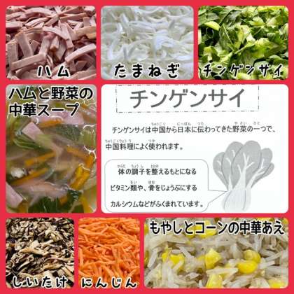 「ハムと野菜の中華スープ」は、ハム、たまねぎ、にんじん、しいたけ、チンゲンサイを使用し、塩、こしょう、うすくちしょうゆ、中華スープの素で味つけしています。