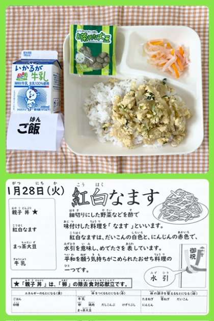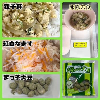 今日の献立は、親子丼・紅白なます・まっ茶大豆・牛乳でした。