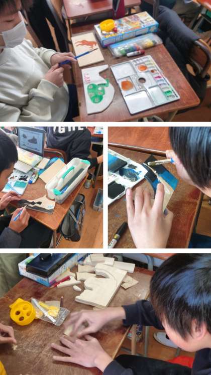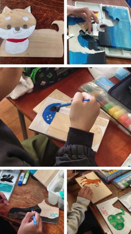 電動糸のこぎりで板を切ったあと、絵の具で色付けをしています。