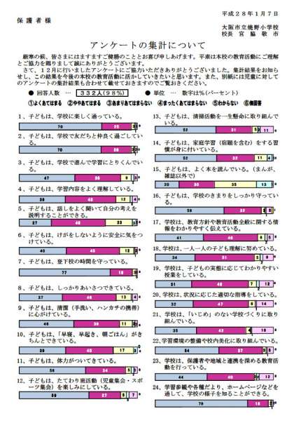 昨年12月におこないました焼野小学校教育アンケートにご協力いただきありがとうございました。そのアンケートの結果につきましては、始業式の日にお手紙をお渡しいたしました。ホームページにもアップいたします。
