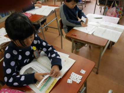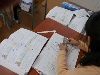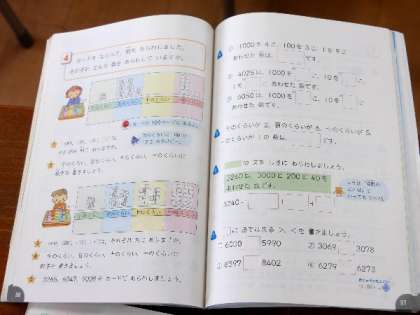 教科書についているカードを使って、大きな数について学習しています。目でみて体感して数字を考えましょう。