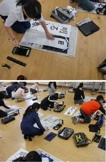 5年生が多目的室で書初めの練習をしています。「明るい春」大きいとバランスがむずかしいですね。春には6年生です。明るい焼野小学校になるように頼みます。
