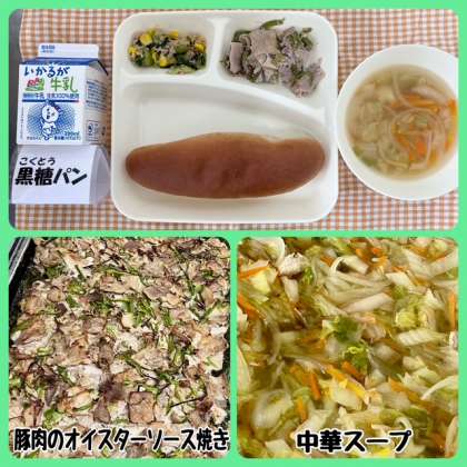 今日の献立は、豚肉のオイスターソース焼き・中華スープ・ツナとチンゲンサイのいためもの・黒糖パン・牛乳でした。