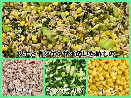 「ツナとチンゲンサイのいためもの」は、ツナ、ゆでたチンゲンサイ、コーンをいため、塩、こしょう、こいくちしょうゆで味付けしています。