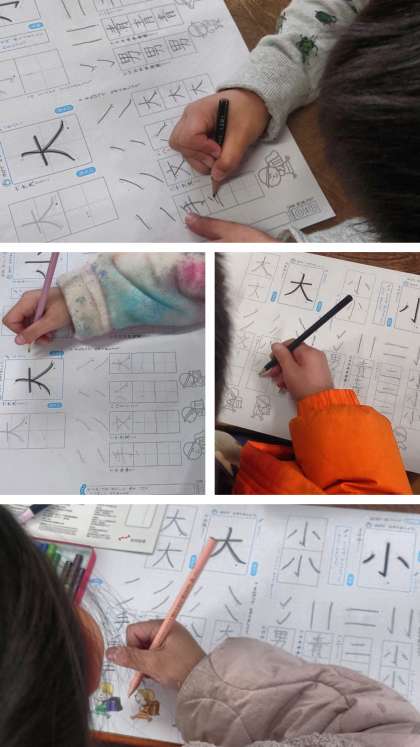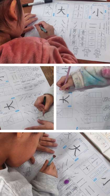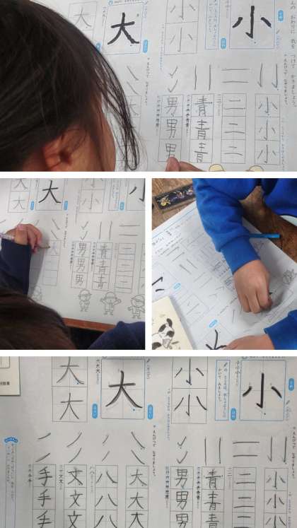 書写の時間は、書写ノートに「大」「小」などの漢字の書き方を練習しました。