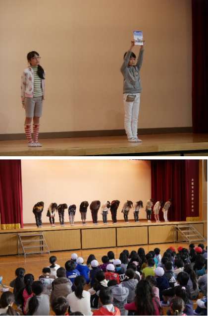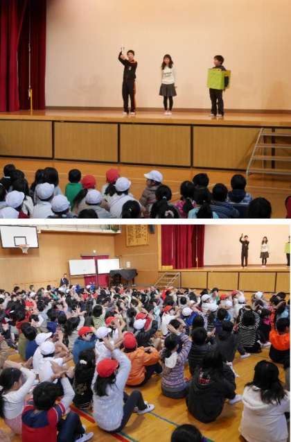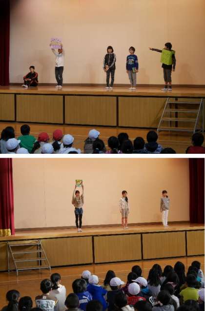 児童集会で、図書委員会の発表がありました。図書委員会の活動や図書室に関する問題をみんなで答えました。おすすめの本の紹介もしてくれました。