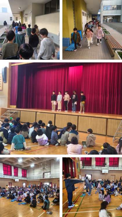 今日の児童集会は、ドレミ班(たてわり班)ごとに講堂に集合して行いました。