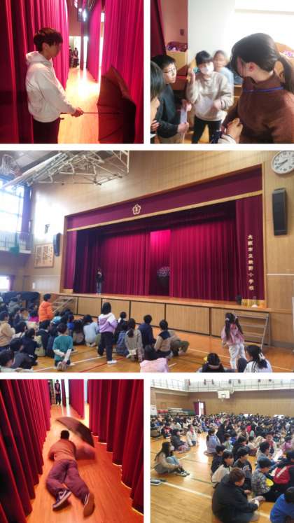 教職員がかさで姿をかくしながら、いろいろなポーズでカーテンの間を通っていきました。