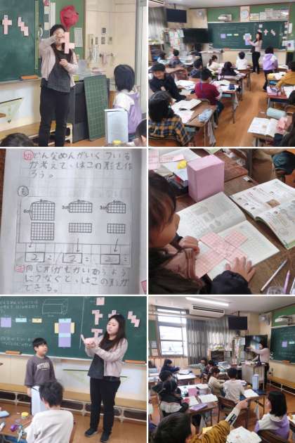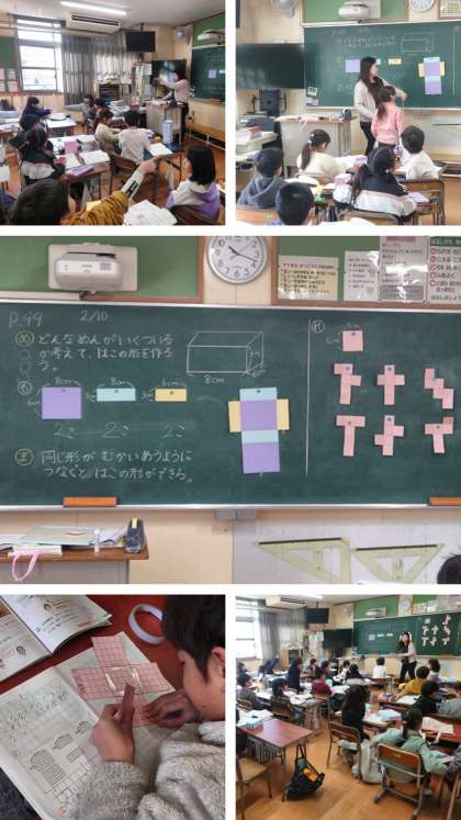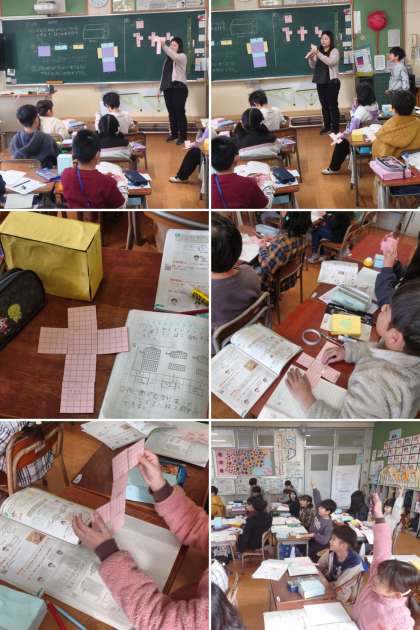 授業の終わりに、「はこの形」を作るために、いろいろなつなぎ方を考えて発表しました。