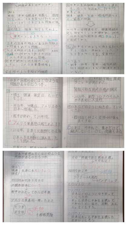 そして、今なお解決していない日本や国際社会の問題について教科書や資料集で調べ、分かったことをノートに箇条書きで書いていきました。