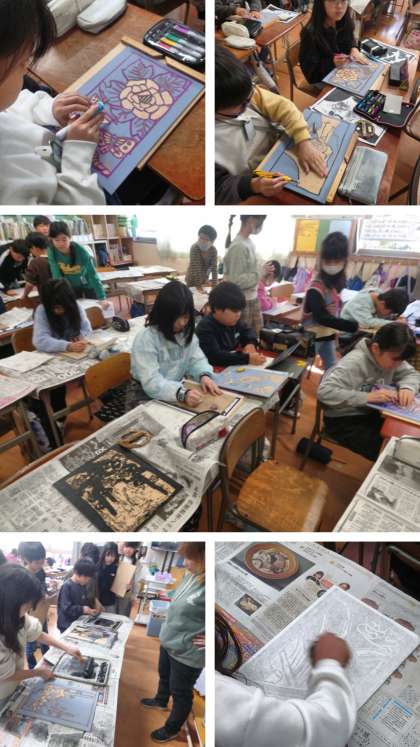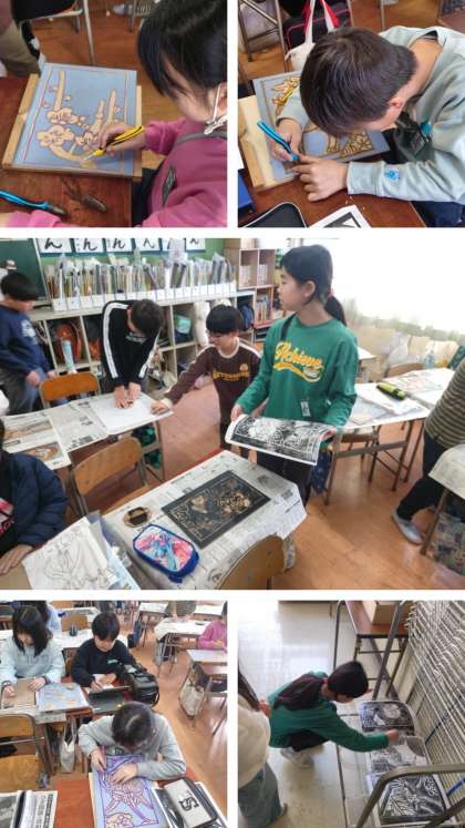 彫り終わった子どもたちから、ローラーで版木にインクをつけて刷り紙をのせ、バレンでくるくるこすります。